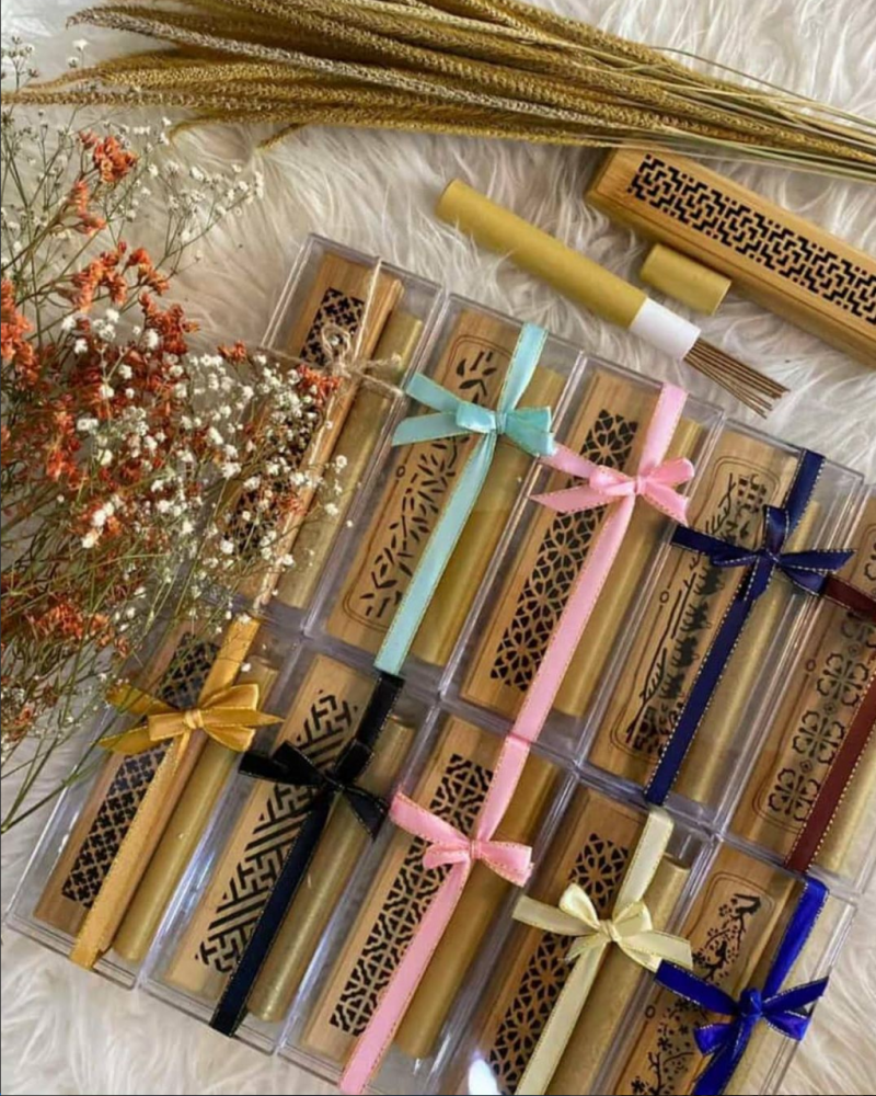 مبخرة ذكية لون خشبي بطول 15 سم مغلفة ومزينه مثل الصورة20 اعواد للند موروركي فاخر بطول 10.5 سم او كمبودي فاخر بطول 10.5 سم